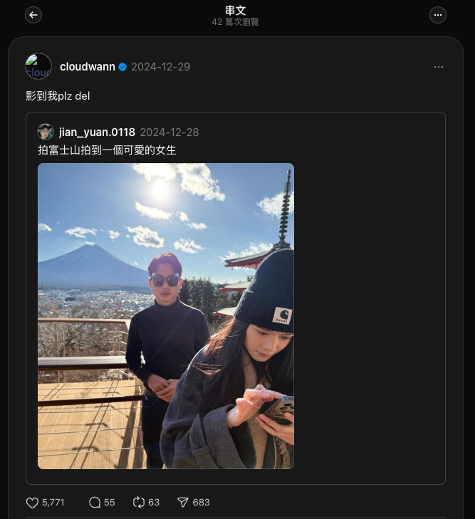 另外雲浩影(Cloud)在2024年時與友人遊日本,被台灣一名男網友意外拍攝到並上載圖片至Threads上指「拍富士山拍到一個可愛的女生」,該圖片在Threads上獲大量轉發,並獲Cloud留意到照片之後,搞笑地轉載照片說「影到我plz del」,令「影到我plz del」成為潮語。